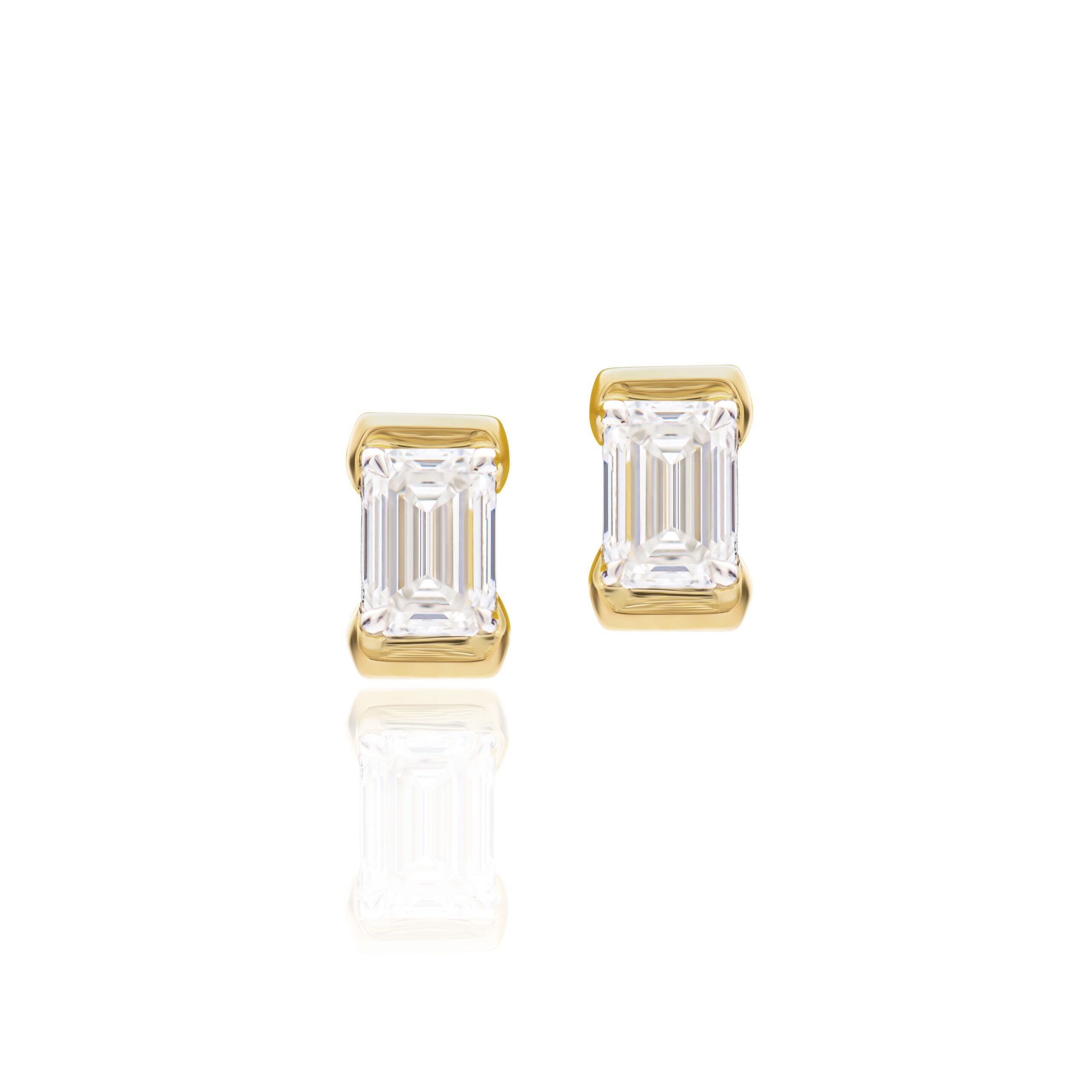These earrings effortlessly combine elegance and sophistication. The emerald-cut diamonds are embraced by layers of gold, creating a captivating visual effect. The 18k yellow gold enhances the diamond's brilliance, while the lightweight design ensures comfort for everyday wear or special occasions. They can also be sold separately, allowing for versatile styling options. Details: - 18k Yellow Gold and Platinum - 2 GIA Certified Colorless (D-F) Emerald-Cut Diamonds (0.61 tcw)