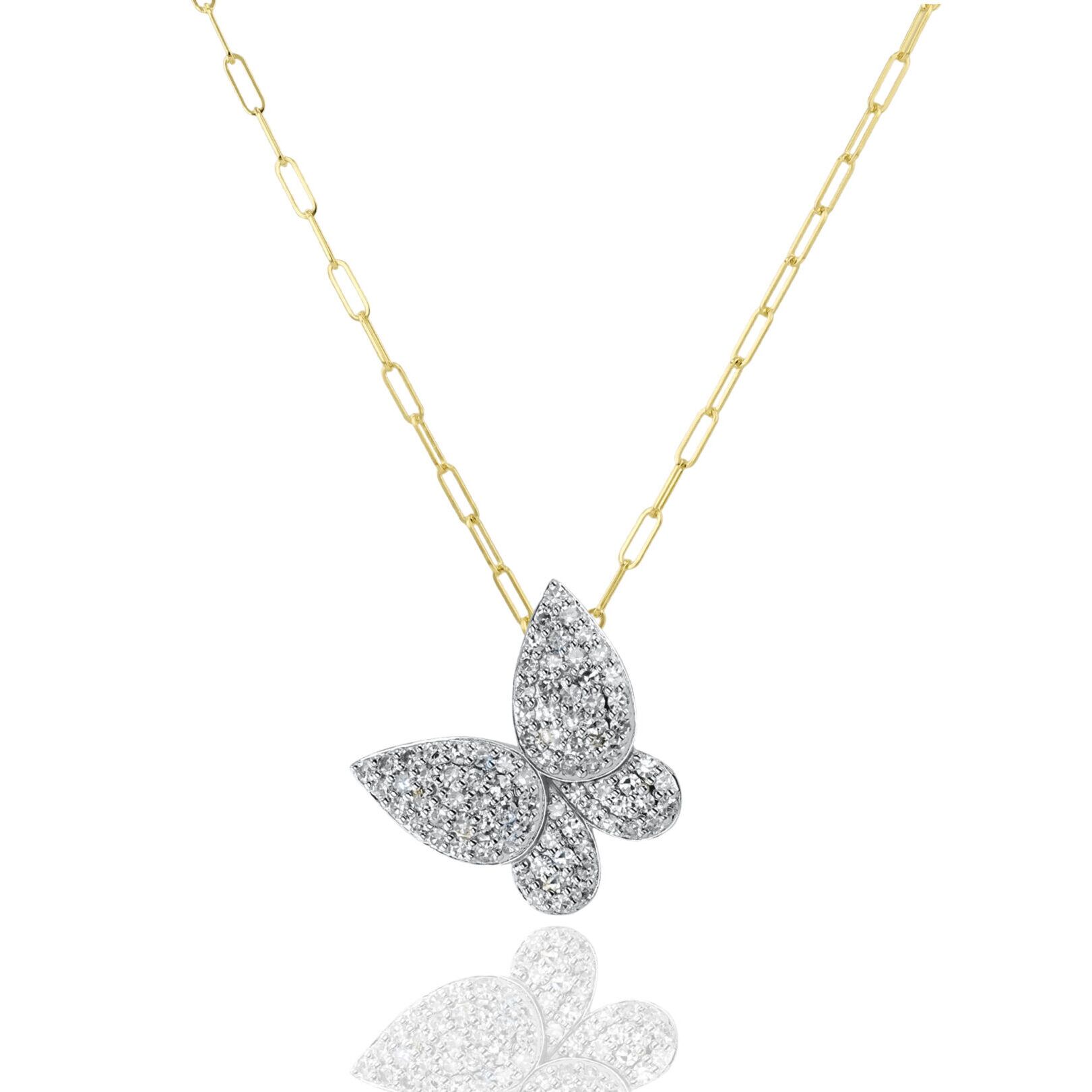 Embracing the beautiful nature of a butterfly, the all-pave diamond design adds a touch of elegance, while the unique curvature of the pendant enhances the maximum sparkle. Its size allows for effortless layering with other necklaces. This necklace is the perfect everyday accessory adding a touch of nature-inspired sophistication to your look.