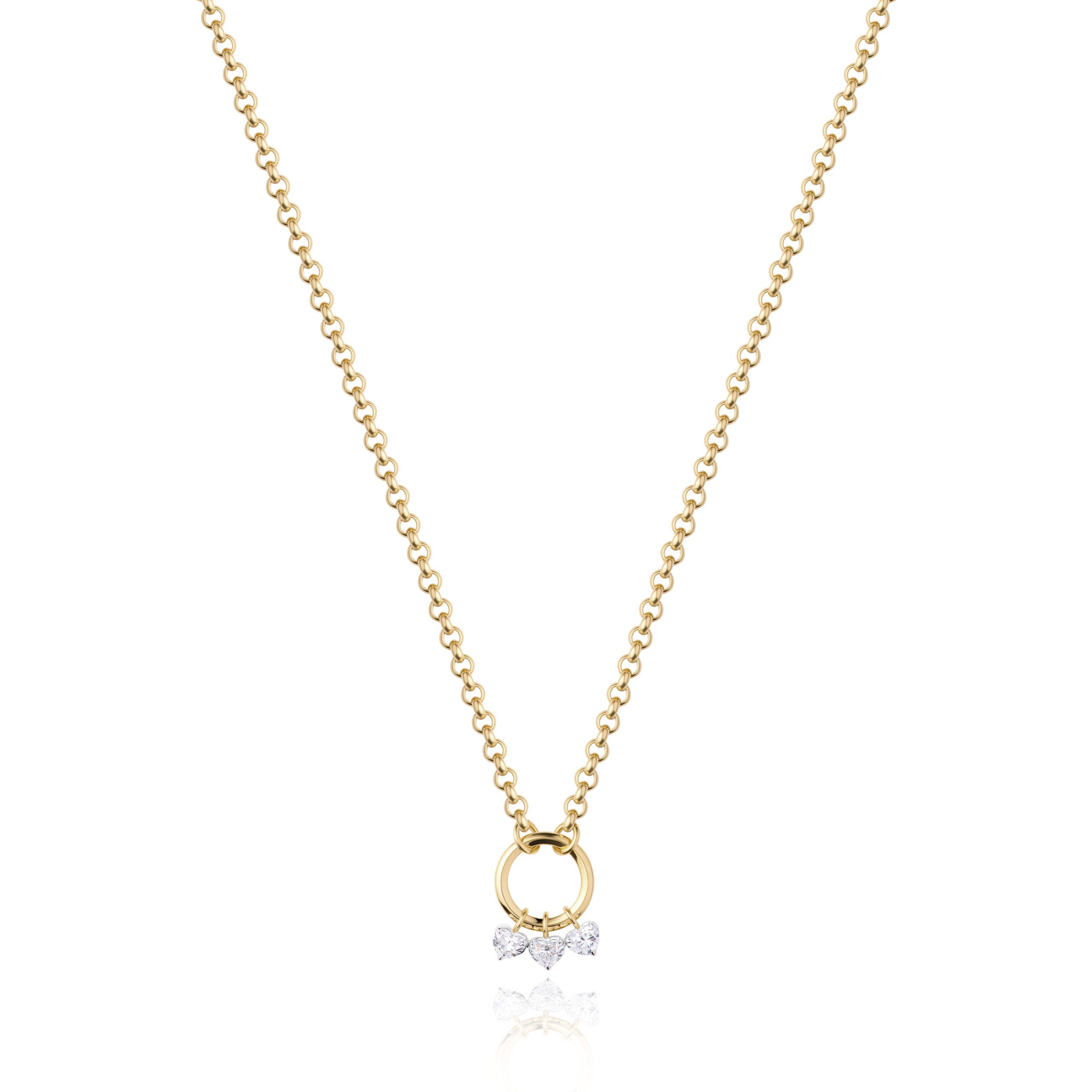 This stunning necklace features a gold ring pendant suspended from the chain. Three heart-shaped diamonds gracefully dangle from the ring, embraced by platinum settings. The seamless blend of 18k yellow gold and platinum enhances the brilliance of the diamonds, creating a captivating display of beauty and grace.