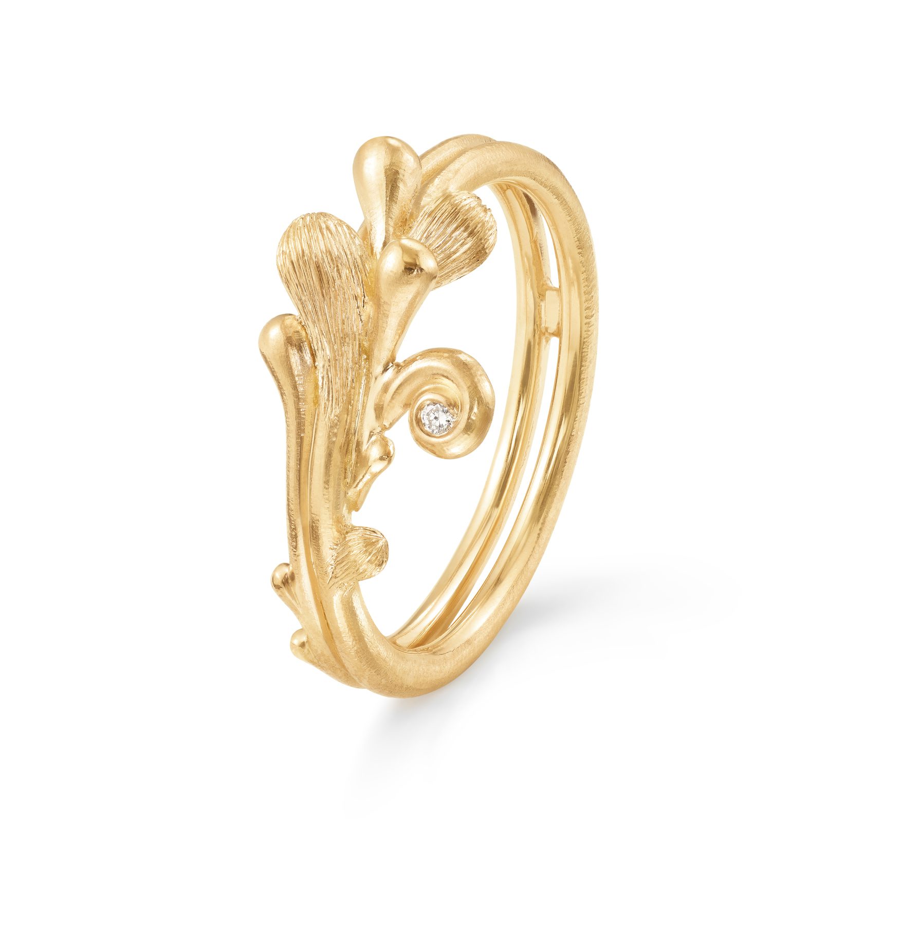Designed by Charlotte Lynggaard, the Boho ring is crafted from 18 karat yellow gold with a diamond 0.008 carat TW. VS. Handcrafted by master goldsmiths, the visible gold surfaces are hammered and satanized to achieve matt textures, whilst the inside of the ring has a polished finish. Part of the Boho Collection.