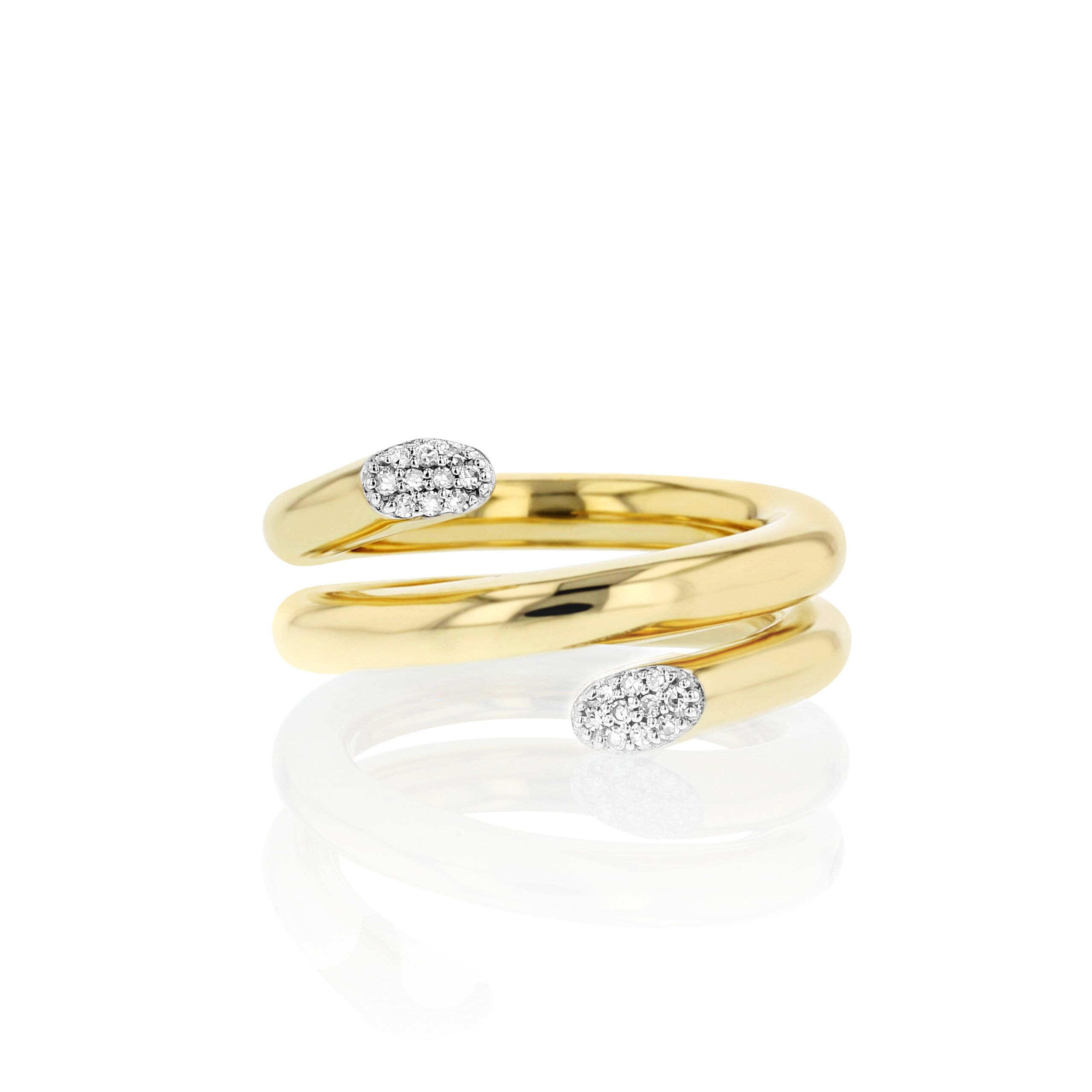 A luxe vibe from a classic silhouette, this stunning ring wraps perfectly around your finger featuring high polished gold and kisses of diamonds.