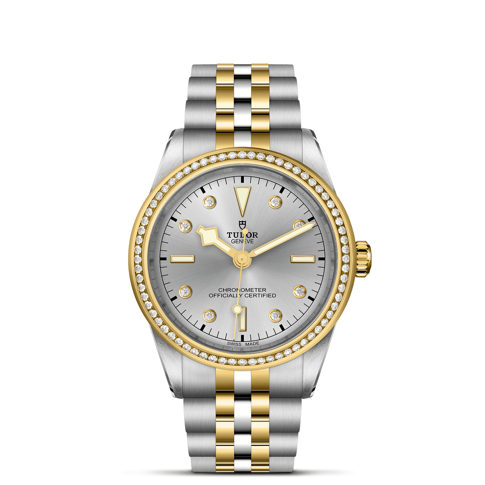 Bezel: Fixed bezel in steel covered by a 0.3mm 18 ct yellow gold cap, set with diamonds, Bracelet: Yellow gold center links at 6 and 12 o’clock, Dial: Silver with diamond hour markers, Manufacture Calibre MT5602 (COSC), Winding Crown: Screw-down winding crown with the TUDOR rose in relief. Steel covered by a 0.1mm 18 ct yellow gold cap-