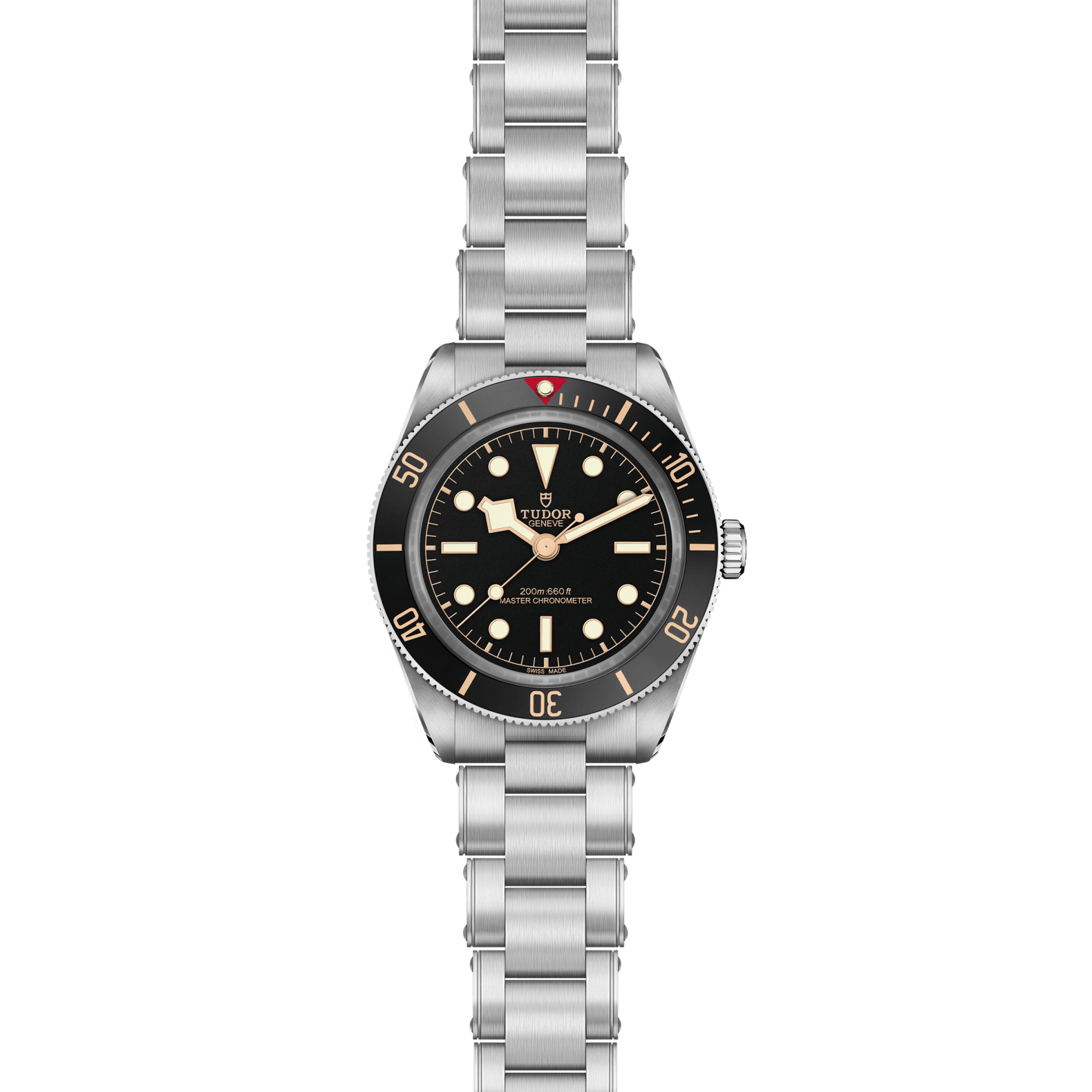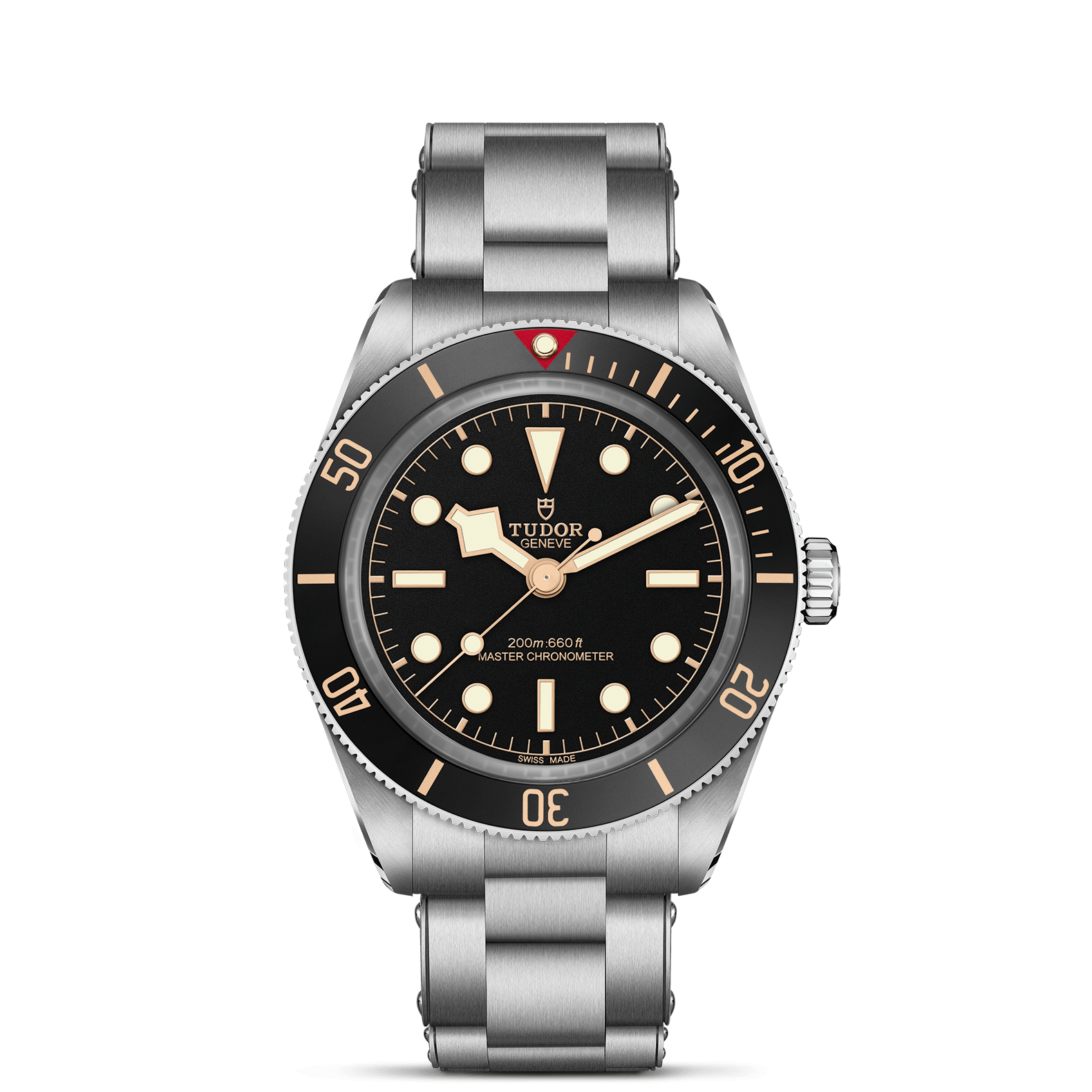 3-link “rivet-style” stainless steel bracelet with polished and satin finishes with TUDOR “T-fit” clasp, Bezel: Unidirectional rotatable bezel in stainless steel with anodized aluminum insert, Dial: Matte black, domed, with applied hour markers, Manufacture Caliber MT5400-U (COSC and METAS certified), Stainless steel screw-down winding crown with the TUDOR rose in relief-